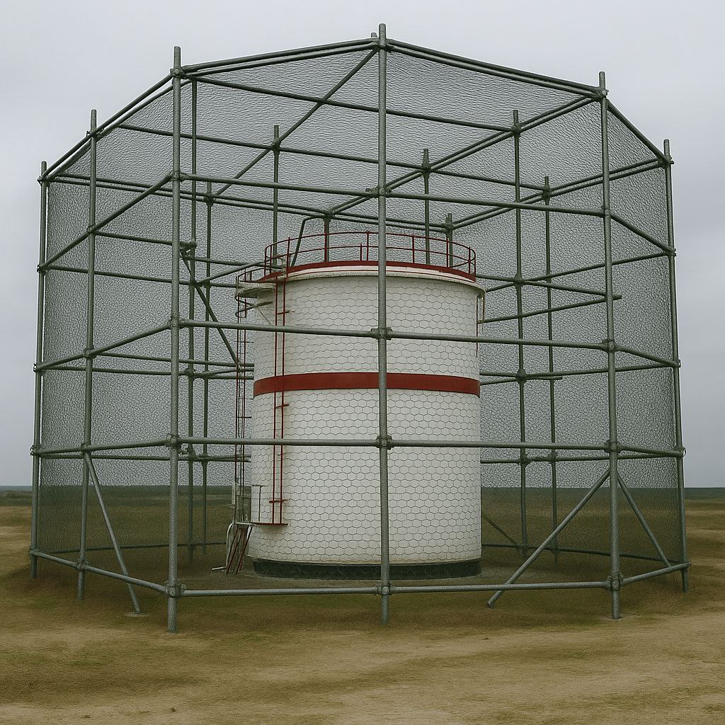 Каркас затягивается прочной металлической или композитной сеткой в соответствие с СП 542.1325800.2024 «Защитные ограждающие конструкции от беспилотных летательных аппаратов»